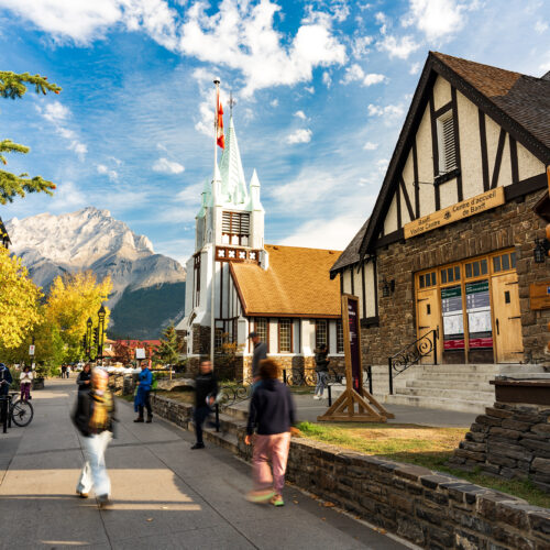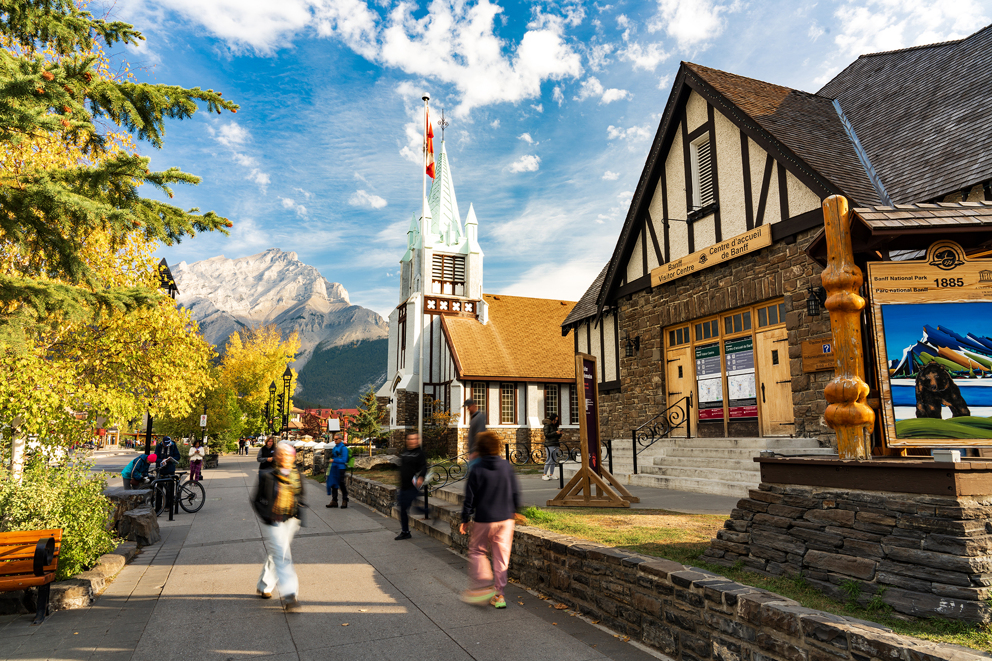 A vibrant and picturesque capture of the heart of the Canadian Rockies, this image transports you to a perfect autumn day on Banff Avenue, Alberta.