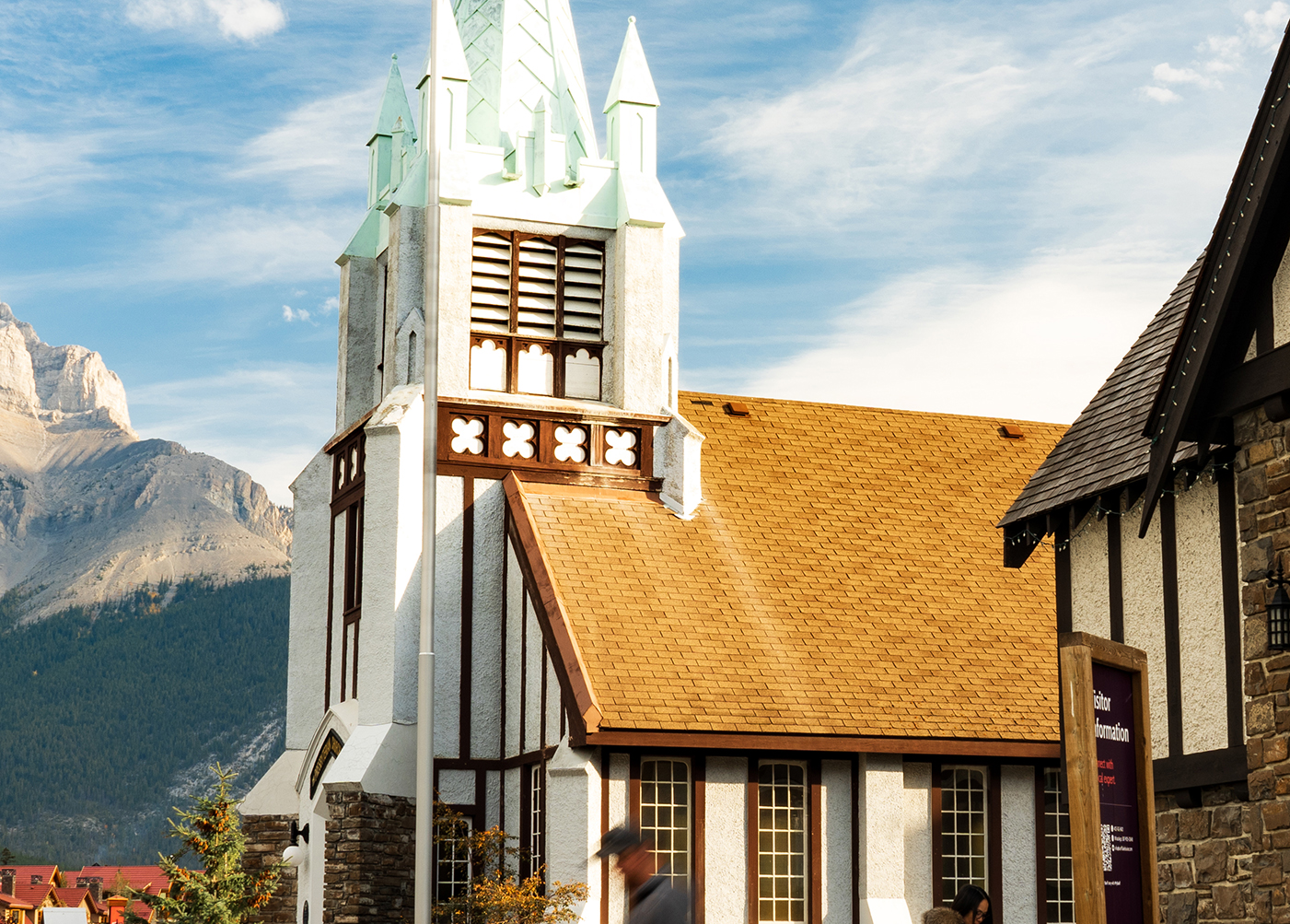 This photograph beautifully balances the natural splendor of Banff National Park with the charming, historic architecture of the townsite. The scene is dominated by the striking, stone and timber-framed architecture of the Banff Park Museum National Historic Site, with its characteristic steep roofline, set against a backdrop of a brilliant blue, cloud-streaked sky. To its left, the iconic white spire of a nearby church provides a dramatic vertical element, topped with the Canadian flag.
