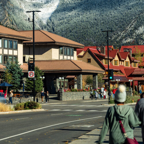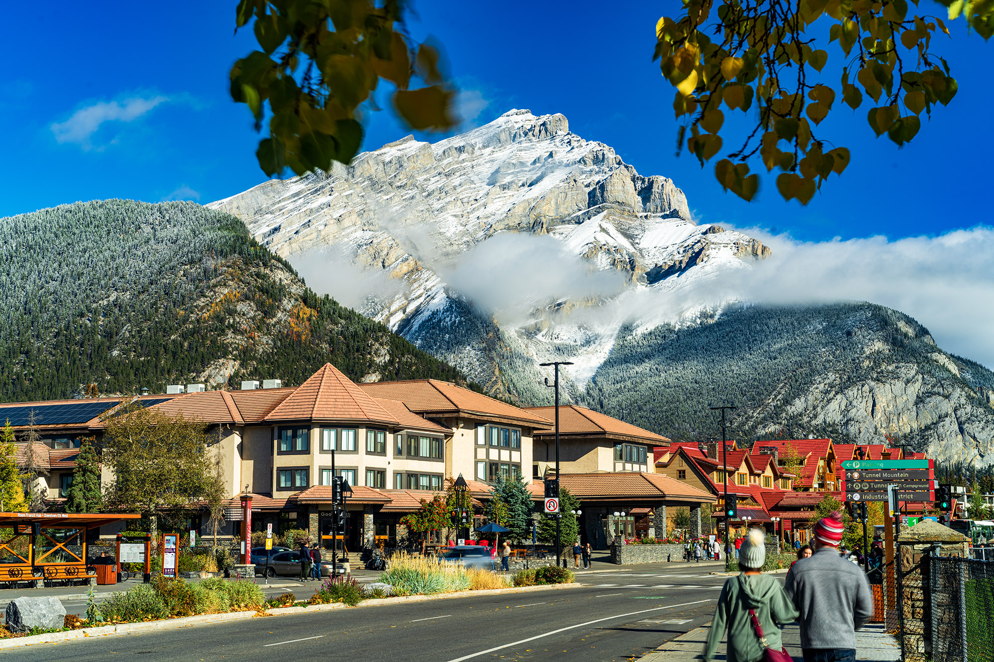 The foreground features the famous Banff Avenue, which stretches like an arrow pointing directly to the mountain’s formidable base. The street is lined with the charming, character-filled architecture of this historic mountain town, with streetlights casting a warm, inviting glow against the cool, clear mountain light.