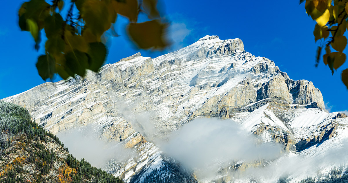 This iconic photograph perfectly frames the heart of Banff National Park, showcasing the vibrant townsite nestled in the breathtaking scale of the Canadian Rockies. The scene is dominated by the majestic presence of Cascade Mountain, its snow-capped peak and towering, rugged slopes forming a dramatic backdrop that asserts the wild nature of the park.