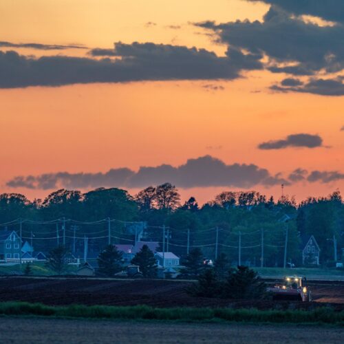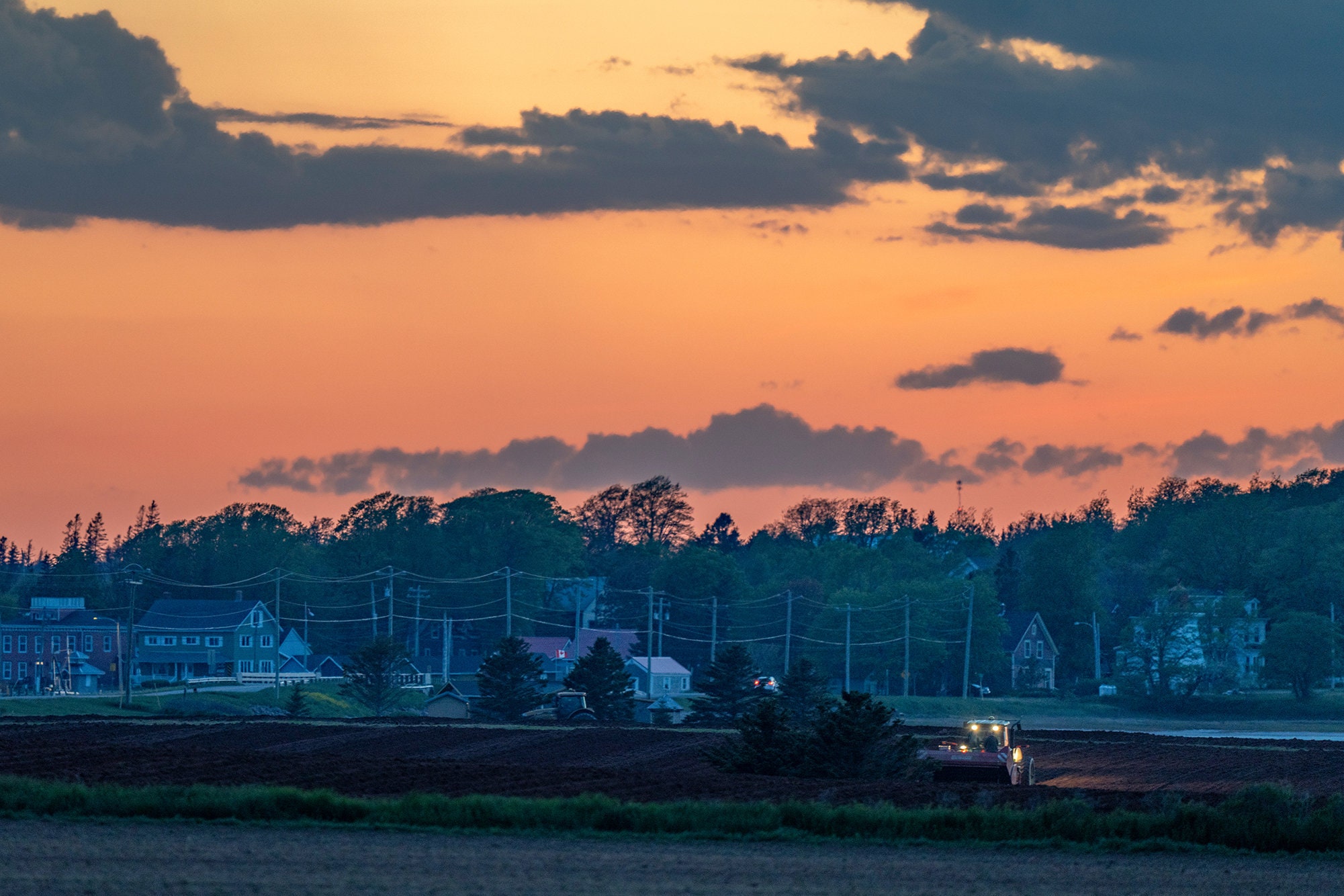 Description: Farming continues as an amazing sunset happens in Victoria by the Sea on Prince Edward Island. The planting season is a major thing on PEI as farmers work late hours to get the crop in the ground.