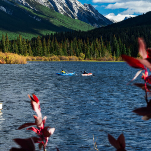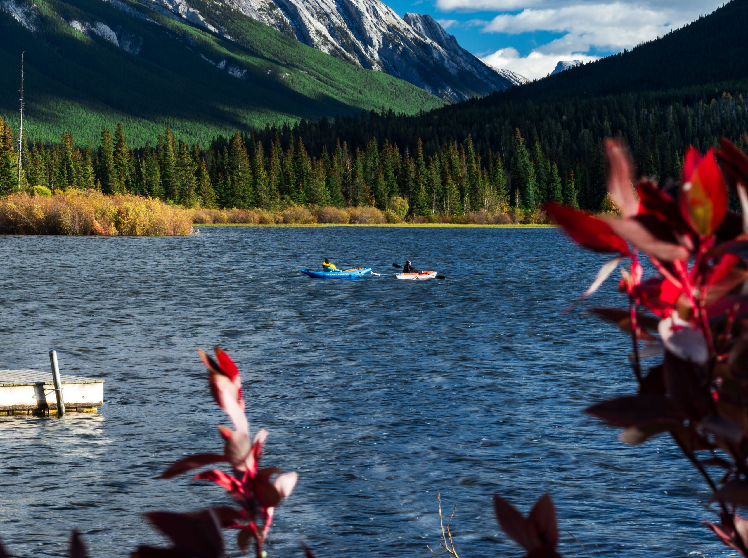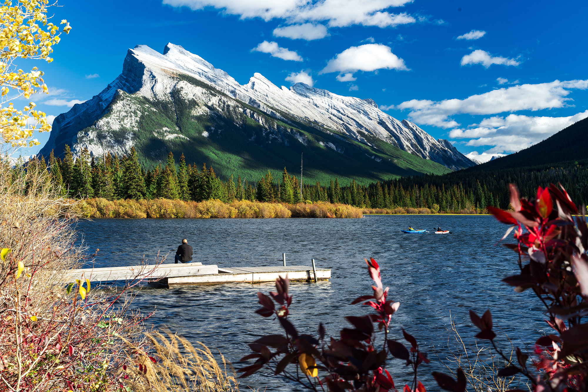 In the foreground, the deep blue waters of Vermilion Lakes near Banff gently lap against a simple wooden dock, where a lone figure sits, contemplating the vast landscape—a poignant symbol of peace and solitude. The surrounding autumn foliage bursts with color, featuring brilliant yellows from the shoreline brush and deep crimson red leaves framing the right side of the composition, highlighting the vibrant fall season in Banff National Park.
