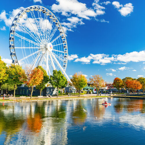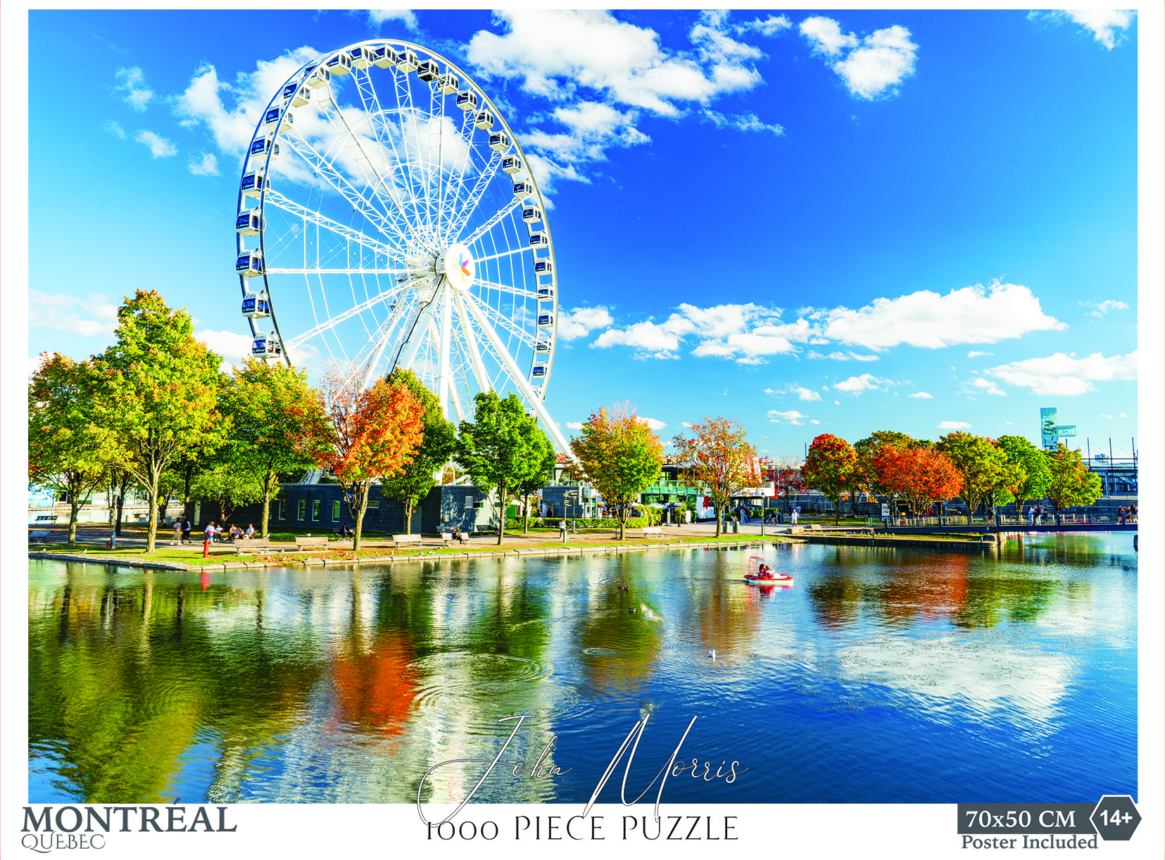 This 1,000-piece puzzle captures a crisp, autumnal day in Montreal, Québec, featuring the iconic La Grande Roue de Montréal (Montreal Ferris Wheel) at the Old Port. The image is a professional photograph by John Morris, showcasing high-quality production values.