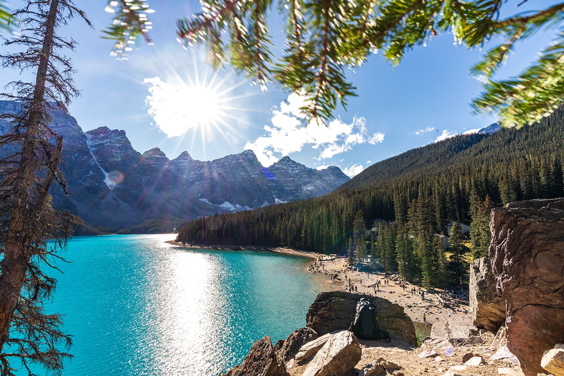 A brilliant sunburst flares in the upper center of the sky, casting bright, shimmering reflections across the water’s surface and highlighting the dense, dark green pine forest that runs along the shoreline. The foreground is anchored by rocky outcroppings and a close-up view of pine boughs, adding depth and a natural, intimate feel to the composition.