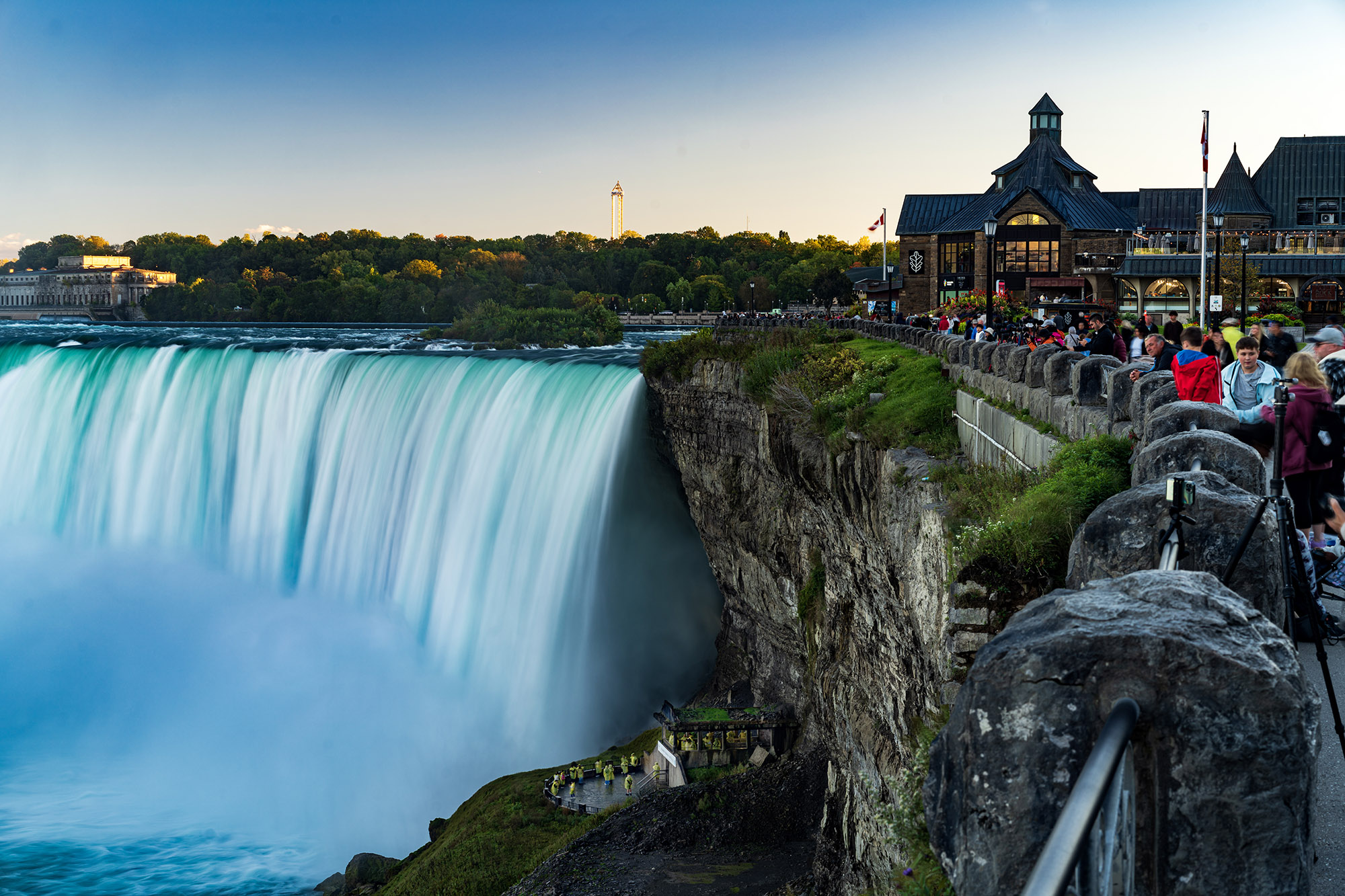 On the right, the energy of the tourist area comes alive. A promenade, bustling with visitors, runs along the cliff edge, adding a sense of scale and human interaction with the massive landmark. The beautifully detailed architecture of a nearby building, perhaps the Table Rock Welcome Centre, is bathed in the rich, warm glow of the setting sun, offsetting the cool blue tones of the mist and sky.