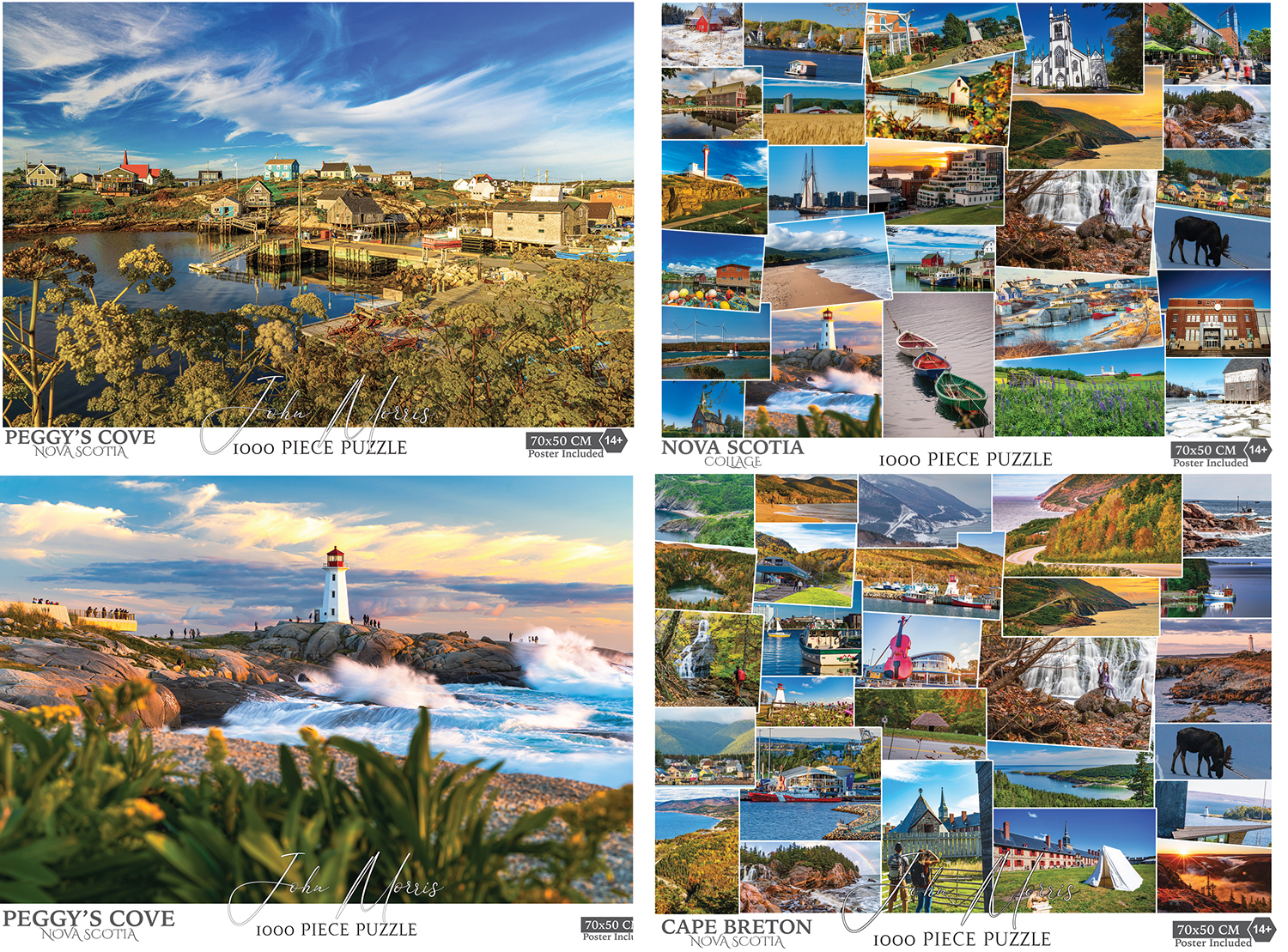 This image showcases a beautiful collection of Nova Scotia-themed jigsaw puzzles by photographer John Morris. The bundle captures the rugged, coastal essence of Canada’s East Coast through a mix of sweeping landscapes and vibrant “collage-style” designs.