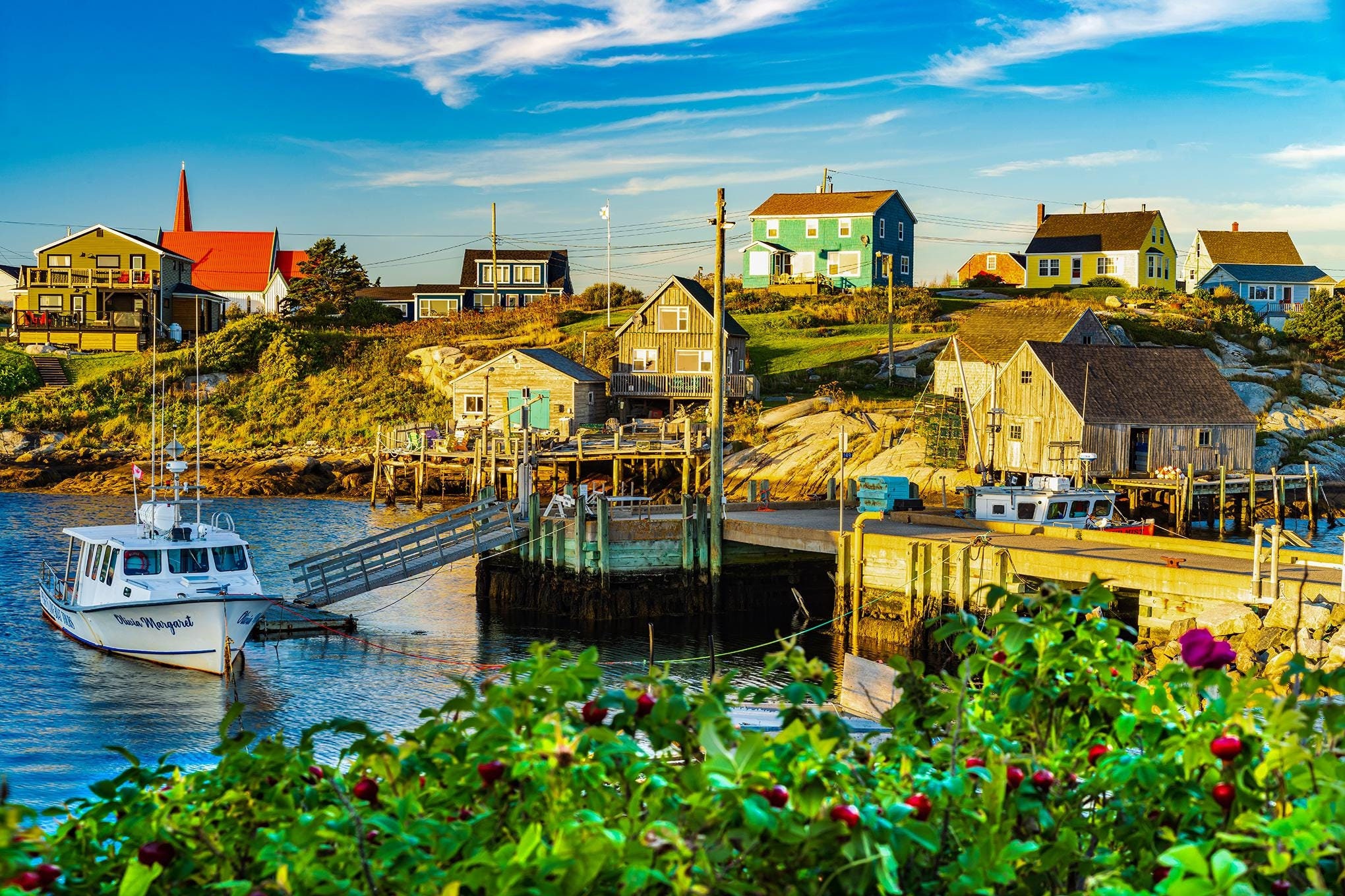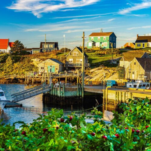 Description: Nova Scotia’s well known Peggys Cove. The harbour/wharf of Peggys Cove with the lighthouse ontop of the hill/in the background.