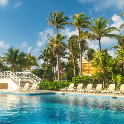 Description: An early morning on the Bahia Principe Luxury Akumal swimming pool in Riviera Maya, Mexico.