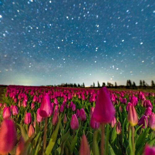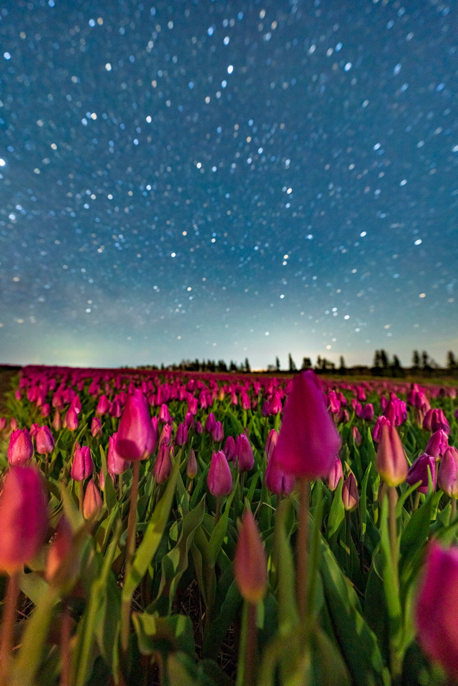 Description: Tulips reach up to the stars in the middle of the night on a farm on Prince Edward Island.