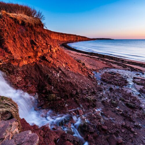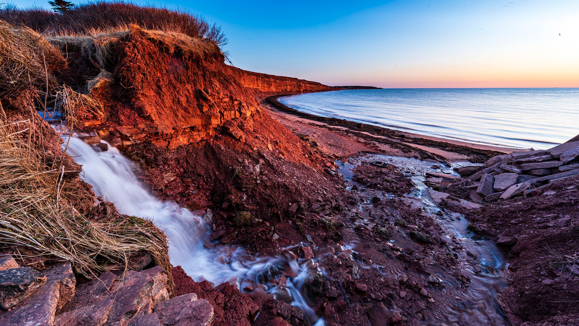 Description: A waterfall runs into the sea with a stunning beach in the background of Howards Cove on Prince Edward Island.
