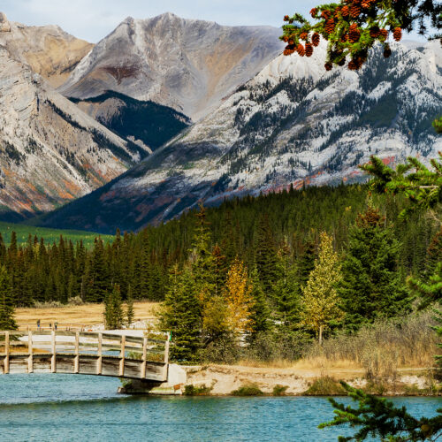Dominating the background are the towering, snow-dusted peaks of Cascade Mountain, its rugged texture contrasting beautifully with the lush, green pine forests that frame the scene. The vibrant blue sky, puffy clouds, and scattered fall foliage add rich colour and depth. A charming wooden footbridge spans the pond, adding a touch of rustic detail to this idyllic mountain biking and road cycling hotspot.